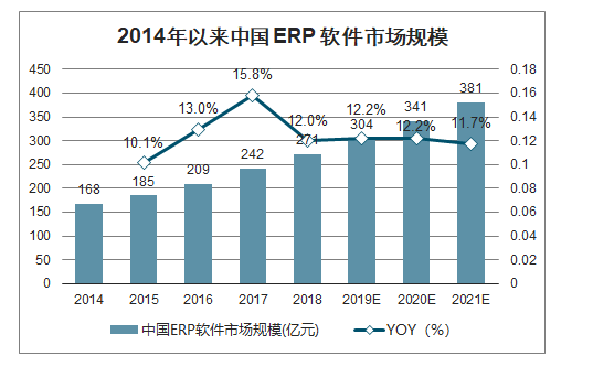 近年來企業管理軟件行業回暖,市場規模增速有望重回兩(liǎng)位數。2012-2014年間受到宏觀經(jīng)濟景氣度和企業IT投資意願等因素影響,國(guó)内主流的企業管理軟件廠商面(miàn)臨低谷期,用友、金蝶等頭部企業營收增速均有不同程度的下滑。2015年以後(hòu)國(guó)内企業管理軟件市場需求逐漸回暖。作爲企業管理軟件的主要大類ERP(企業資源計劃系統),增速高于行業整體。2018年我國(guó)ERP市場規模約271億元,同比增長(cháng)12%,預計未來四年市場規模增速將(jiāng)保持在10%以上。