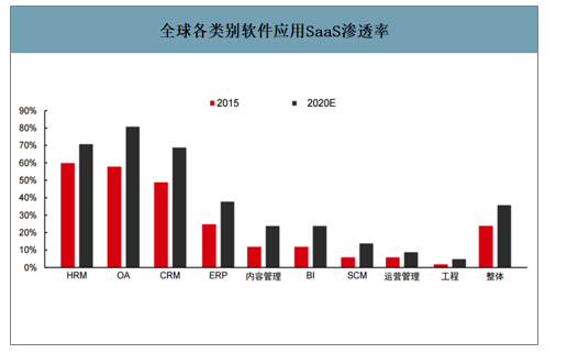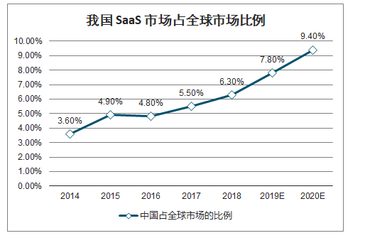 我國(guó)SaaS市場增速高于全球,占全球市場的比例不斷提升。2014年的我國(guó)SaaS市場規模僅占全球的3.6%,預計2020年有望提升至9.4%,預計同期中國(guó)GDP總量占全球GPD比重的16%左右,仍有6個點以上的提升空間。